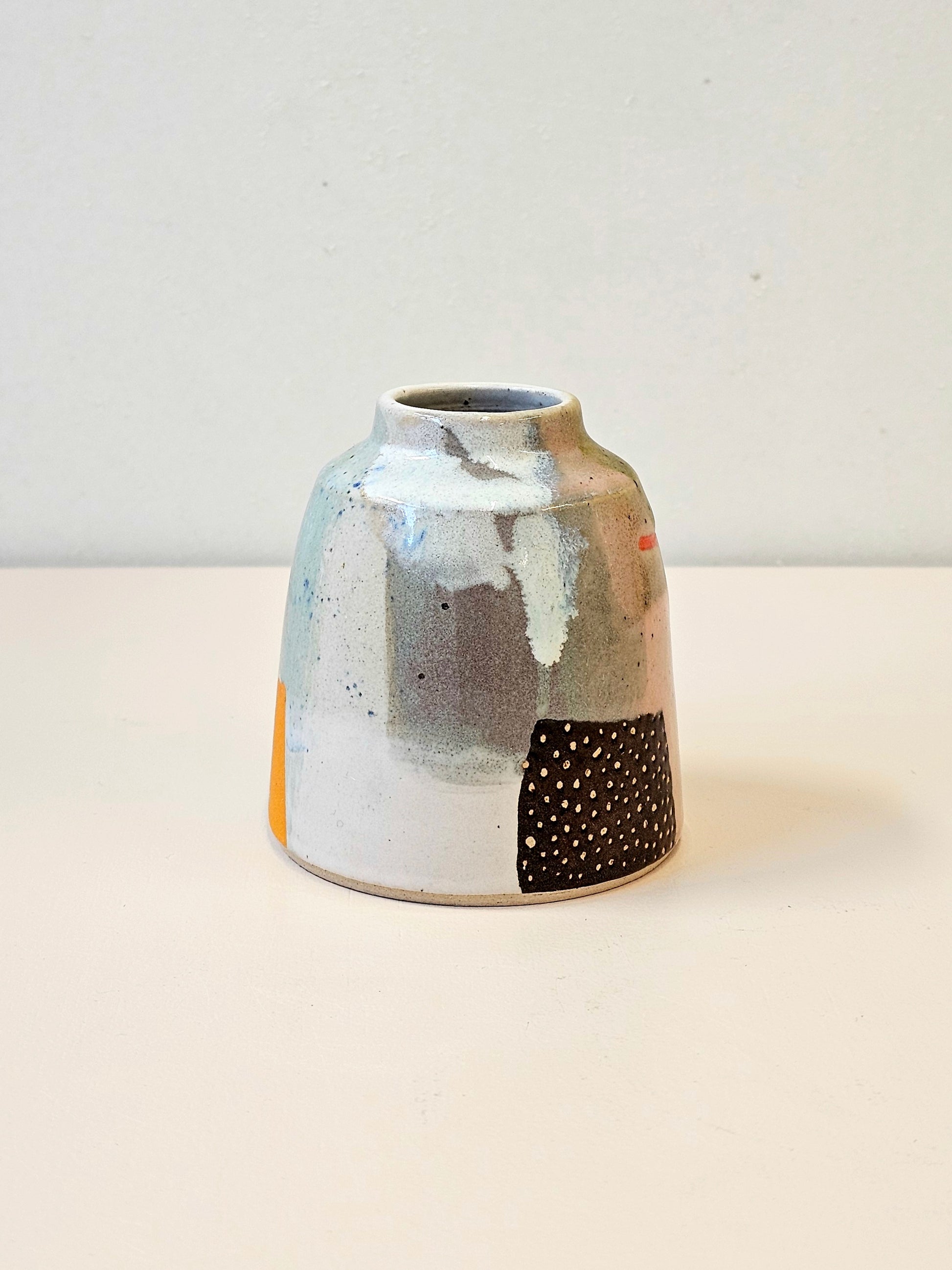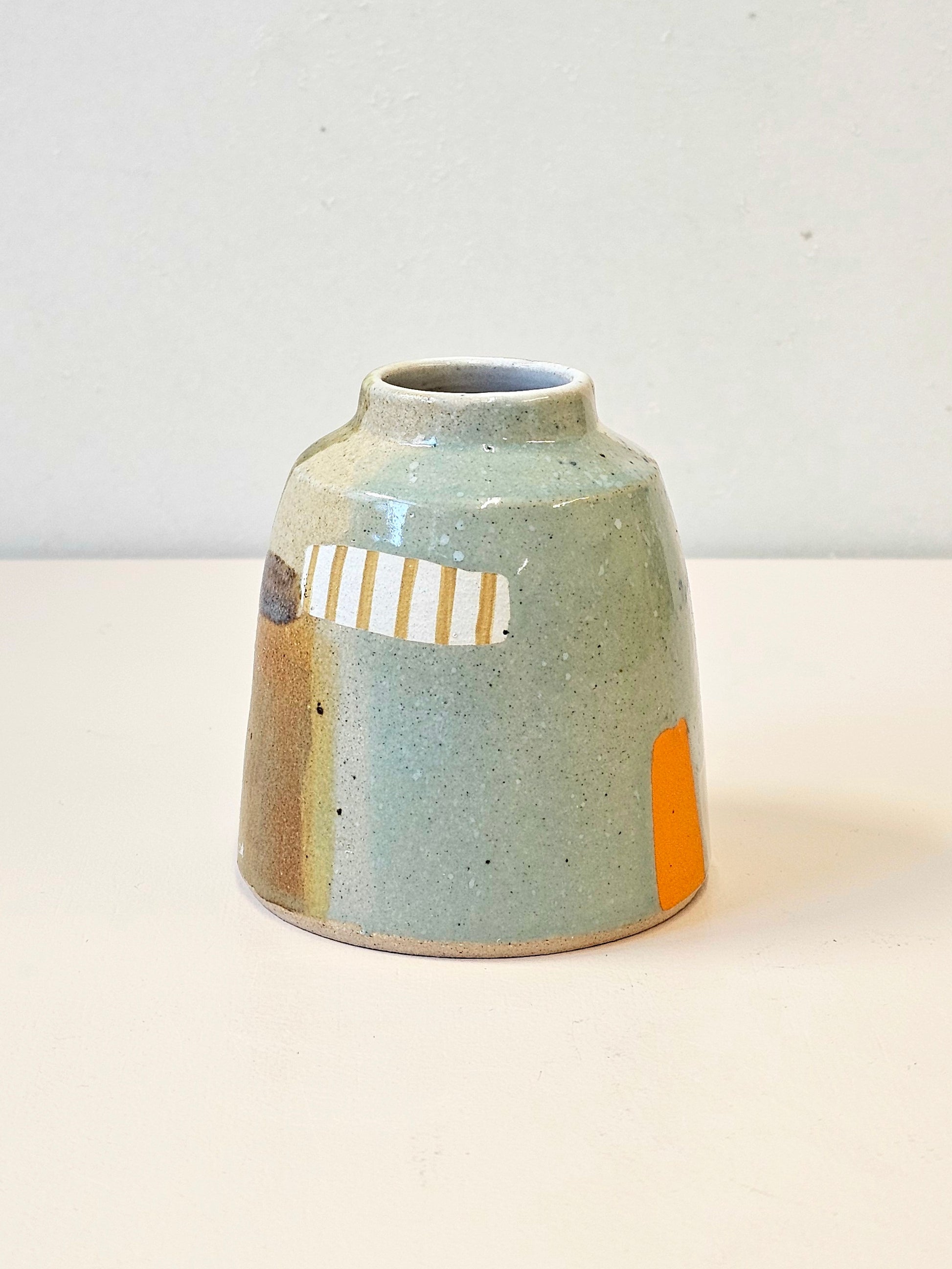 Handthrown bud vase in a lightly speckled stoneware clay. Lovingly decorated in a range of high fire glazes. 8.5cm tall