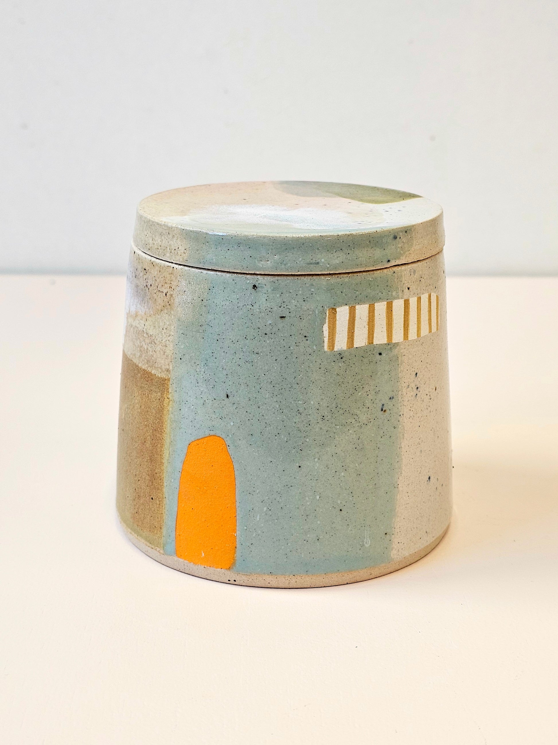 Handthrown lidded jar. Lightly speckled stoneware. Lovingly decorated with a selection of high-fire glazes. 10cm tall